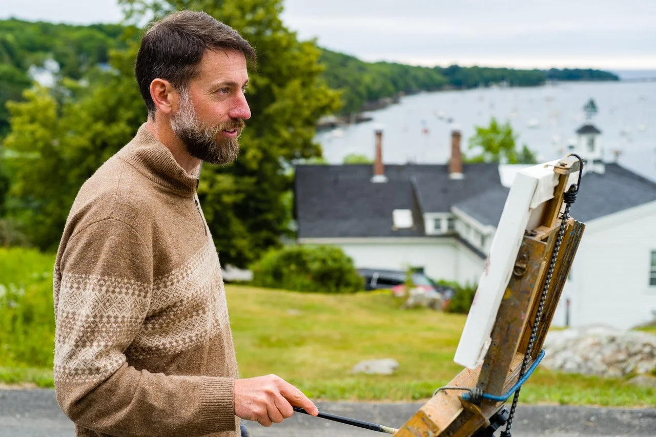 Whether working on location or in the studio, Colin strives to capture the atmosphere and light of a scene. Colin currently lives in Maine, where he focuses on painting the landscape, and scenes that show his life as a father.
